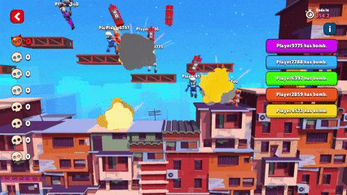 Players jump through traps and obstacles while throwing bombs to slow others or create new paths.